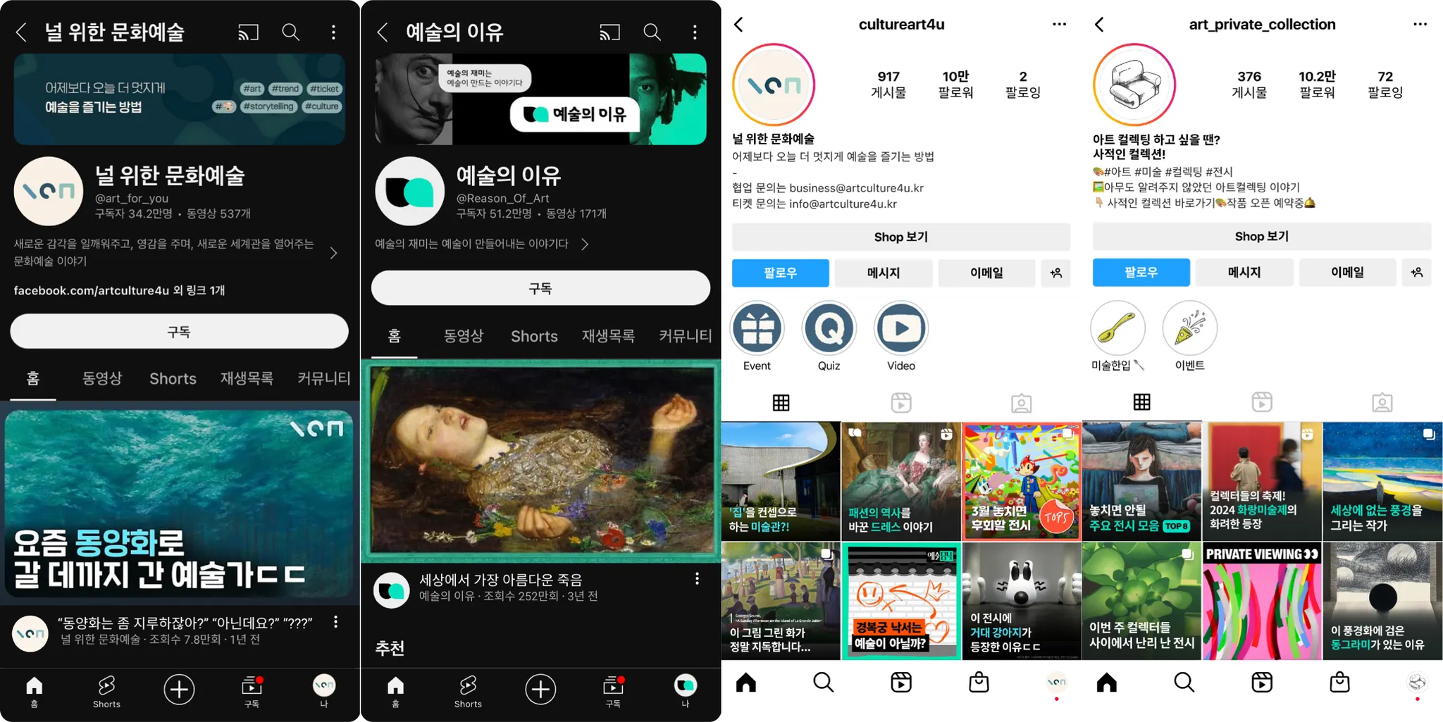 2018년도부터 유튜브 등 소셜미디어를 통해 예술의 이야기를 널리 알려왔고, 현재는 통합 100만 명이 넘는 유저들과 함께하고 있습니다. 현재 공동대표로 함께하고 있으며 널위한문화예술에는 널 위한 문화예술 & 예술의 이유 & 사적인 컬렉션 채널이 있습니다. 저희 팀과의 협업 문의는 business@artculture4u.kr 으로 보내주세요.